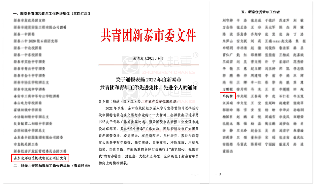 近日,新泰市委共青團(tuán)公布了關(guān)于通報(bào)表?yè)P(yáng)2022年度新泰市共青團(tuán)和青年工作先進(jìn)集體、先進(jìn)個(gè)人的通知,山東龍輝起重機(jī)械有限公司團(tuán)支部榮獲“新泰共青團(tuán)和青年工作先進(jìn)集體(五四紅旗團(tuán)組織)”榮譽(yù)稱(chēng)號(hào),工程師單傳柱榮獲“新泰優(yōu)秀青年工作者”的榮譽(yù)稱(chēng)號(hào)。 2022年,在集團(tuán)公司董事會(huì)的堅(jiān)強(qiáng)領(lǐng)導(dǎo)下,公司涌現(xiàn)出了一大批團(tuán)結(jié)進(jìn)取、勇于創(chuàng)新、成績(jī)突出的先進(jìn)集體和扎實(shí)工作、勤學(xué)向上、拼搏奉獻(xiàn)的優(yōu)秀個(gè)人。 驚艷的履歷沒(méi)有一蹴而就 工程師單傳柱經(jīng)過(guò)十余年不斷思考與探索,逐漸在超大型雙梁起重機(jī)械設(shè)計(jì)研發(fā)領(lǐng)域成長(zhǎng)發(fā)光,以“腳踏實(shí)地,孜孜以求”的實(shí)際行動(dòng)踐行著共青團(tuán)員的擔(dān)當(dāng)。 2022年是中國(guó)共產(chǎn)主義青年團(tuán)成立100周年 在過(guò)去的一年中,龍輝起重各部門(mén)深入學(xué)習(xí)二十大精神,緊緊圍繞市委新型工業(yè)化強(qiáng)市建設(shè)戰(zhàn)略部署,團(tuán)結(jié)帶領(lǐng)全體青年艱苦奮斗、奮勇?lián)?dāng),在疫情防控、鄉(xiāng)村振興、基層治理等活動(dòng)中,充分展現(xiàn)了新泰青年昂揚(yáng)向上的精神面貌。 青春,在實(shí)踐的沃土中綻放 回首百年,青春激昂,一代代有志青年用堅(jiān)韌不拔的頑強(qiáng)意志,在新時(shí)代新征程上留下了青春奮斗的印記。 |